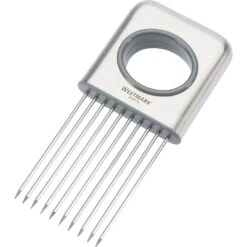 Deze handige uienkam voedselhouder dient als snijhulp voor het gelijkmatig snijden en hakken van vlees, braadstukken en worsten, maar ook groenten en fruit. Met zijn hulp kun je gemakkelijk fijne en gelijkmatig dikke plakken maken – de perfecte hulp voor een geslaagde maaltijd.
